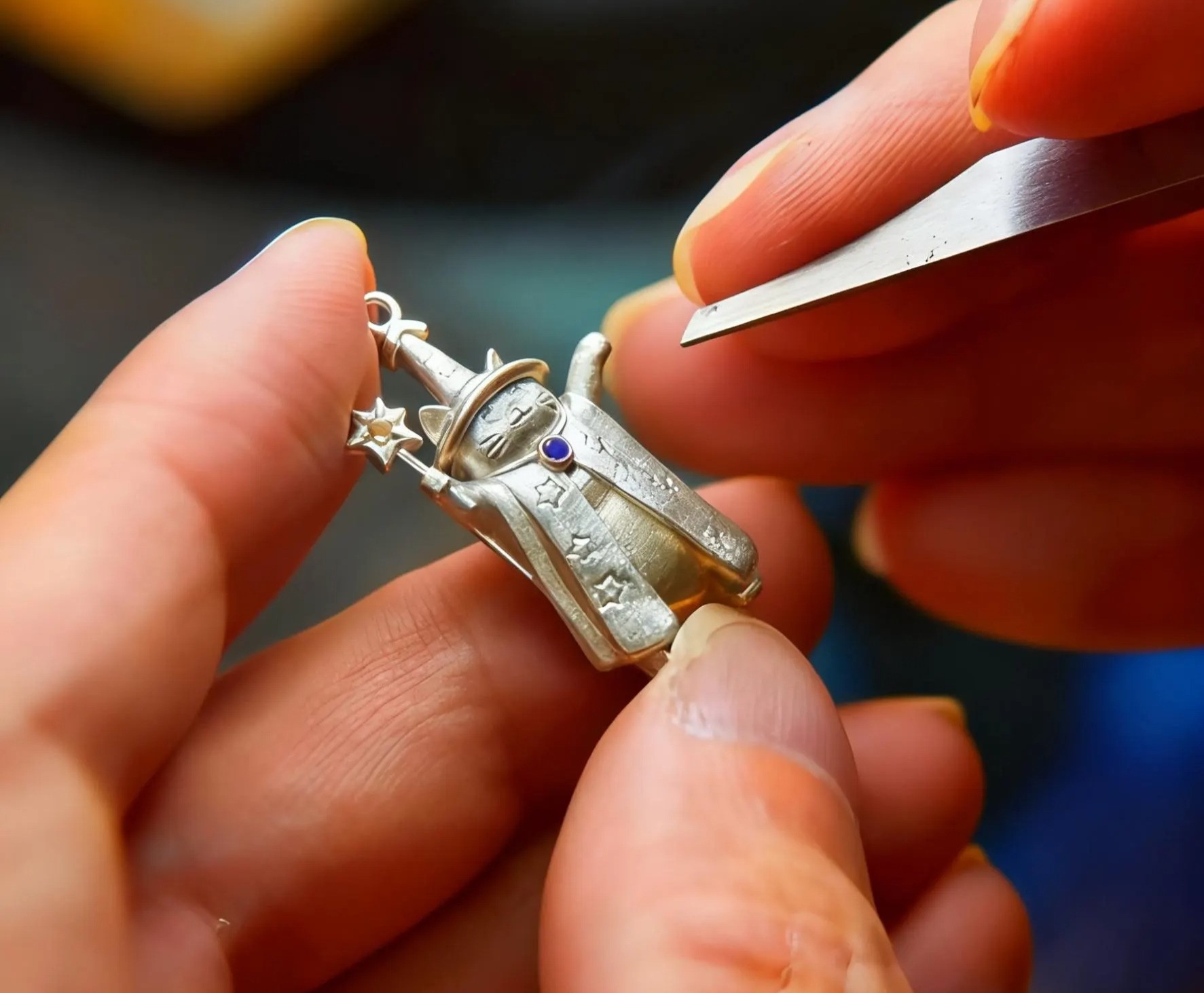Step into a world of quiet magic with this handcrafted Wizard Cat pendant. Cloaked in mystery and crowned with a star-tipped wand, this feline sorcerer doesn’t dwell in distant forests—it stands guard at your heart.